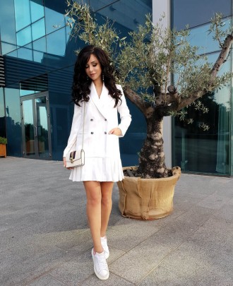 Така цибуля завжди буде доречною, особливо в офісній атмосфері. Сукня-піджак це не тільки практична, а ще й цікава річ, яку можна поєднувати як із човниками, так і з взуттям на низькій підошві. Особливо актуальний цього сезону фасон у смужку.