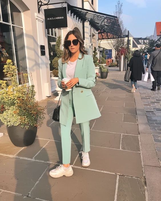 Щоб офісний костюм не виглядав дуже суворо і по-діловому, можна одягнути білу футболку, і образ відразу стане спокійнішим і повсякденним. А для повного комфорту можна додати кросівки чи будь-яке зручне взуття. Особливо доречно біла футболка виглядатиме з яскравими костюмами, і буде вигідно відтіняти будь-який колір.